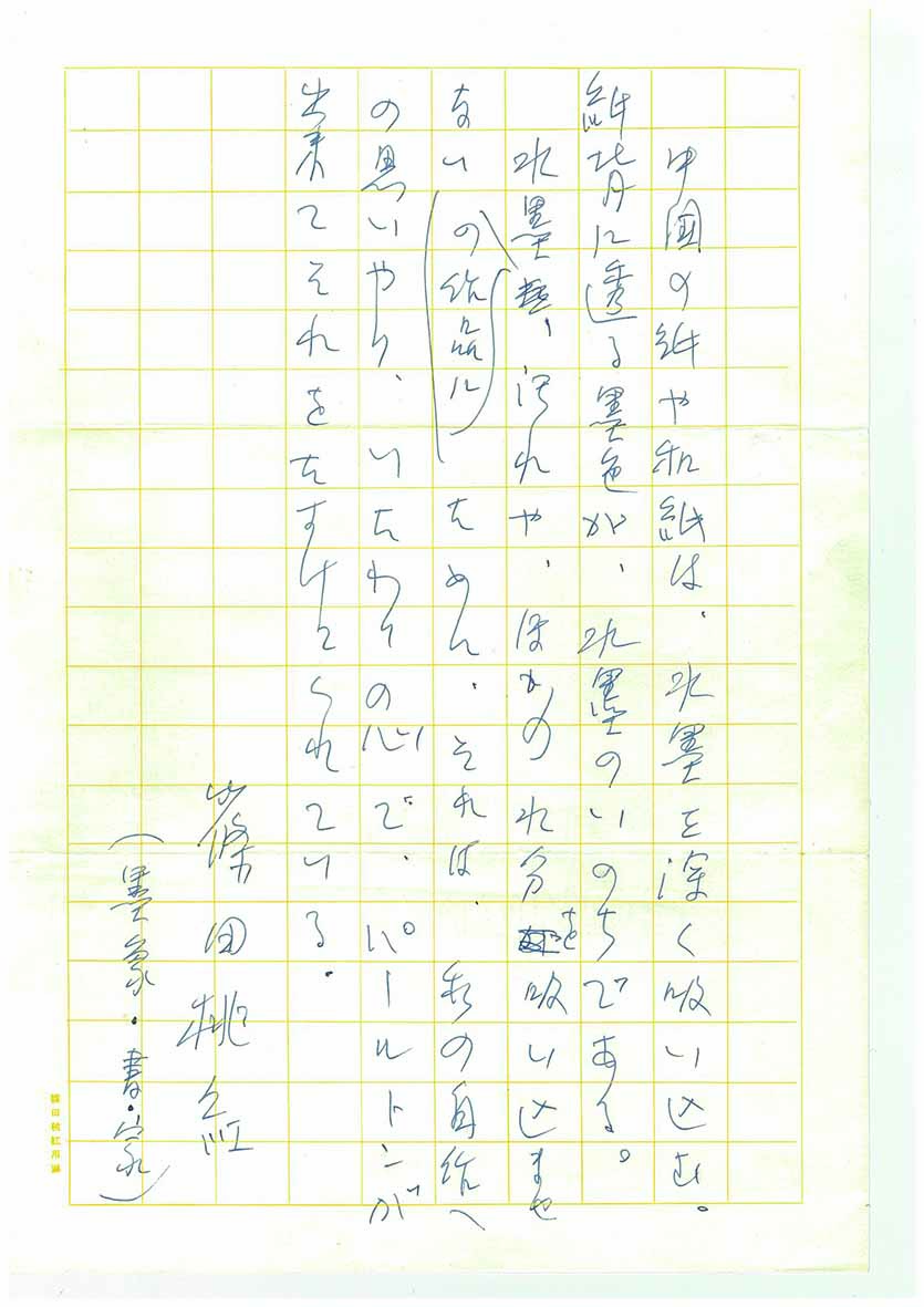 Posted on 2021年3月4日2021年3月4日 by pearltone_kyoto 篠田桃紅先生 3月4日の新聞で水墨画で有名な篠田桃紅先生が107歳でお亡くなりになられたことを知りました。 弊社も昭和59年に篠田桃紅先生の作品にパールトーン加工処理をさせていただき、 その際にいただきました桃紅先生の直筆の推薦状が保存されております。 100歳を超えても意欲的に制作を続けておられるお姿に感銘を受けておりました。 ご冥福をお祈り申し上げます。 共有:クリックして Twitter で共有 (新しいウィンドウで開きます)Facebook で共有するにはクリックしてください (新しいウィンドウで開きます)クリックして Google+ で共有 (新しいウィンドウで開きます) 関連